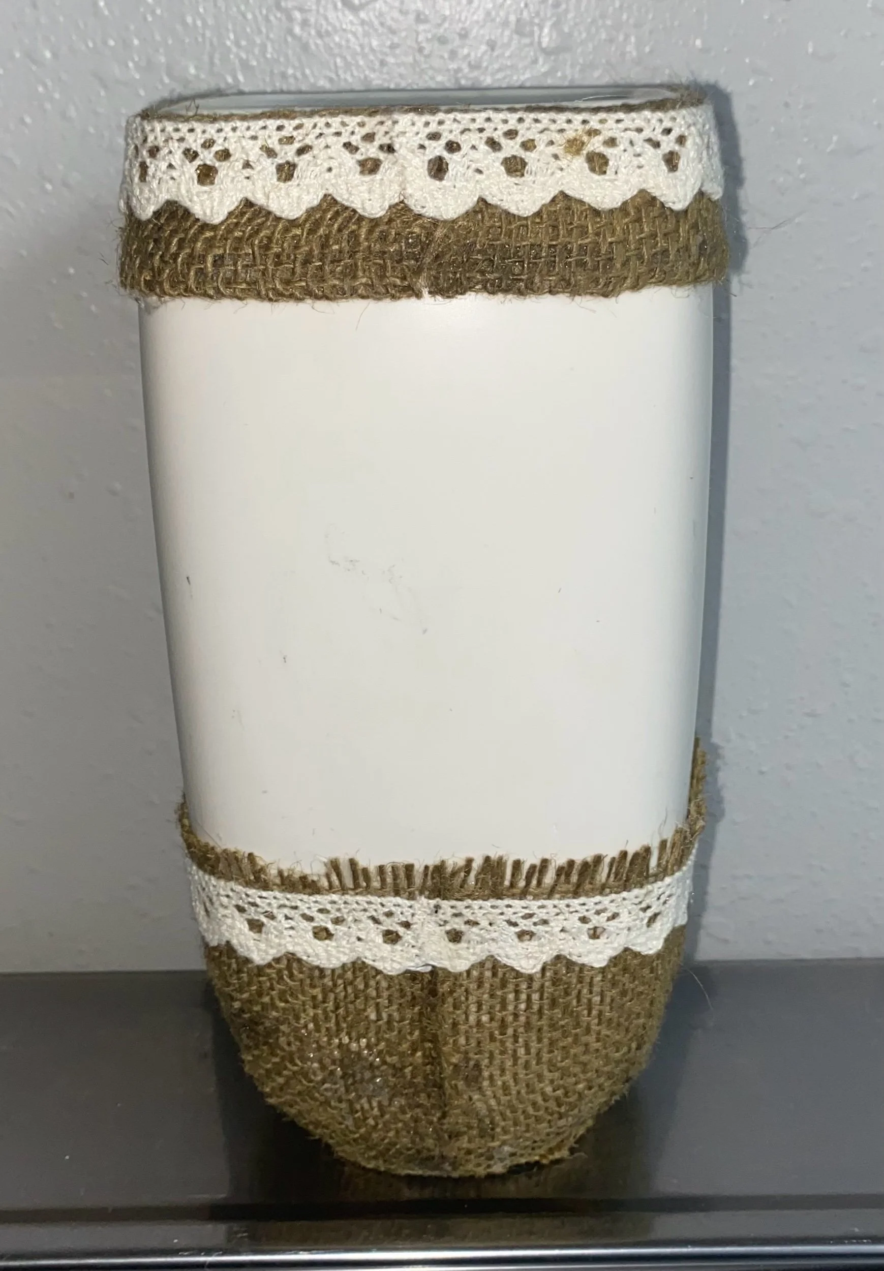 This item is a decorative vase or candle holder, featuring farmhouse-style burlap and lace textures with a metallic cross embellishment.