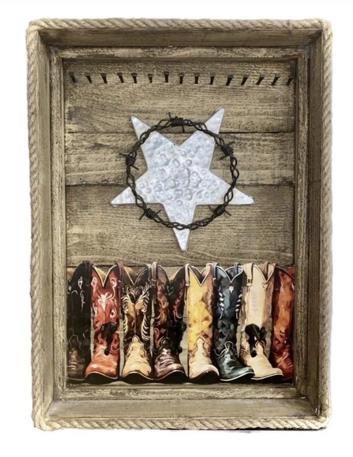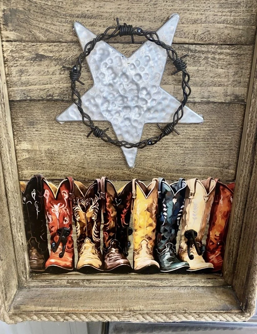 This piece features a distressed rustic wooden plank background framed by rope trim. It incorporates a decorative metal star accent and a row of colorful cowboy boots depicted at the bottom. A line of metal hooks, resembling nails or tacks, runs along the top for hanging items.
