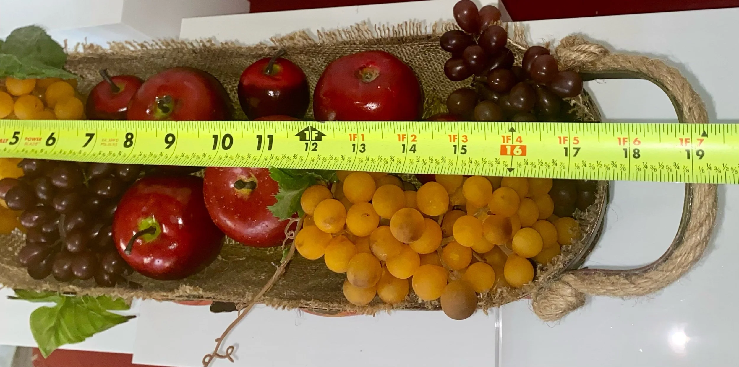 this is a decorative arrangement featuring realistic looking fruit in a rustic-style basket. Multiple large, glossy red apples are the centerpiece, made from foam and acrylic to mimic real fruit. There are clusters of dark purple/brown grapes on the left and golden-orange grapes on the right.