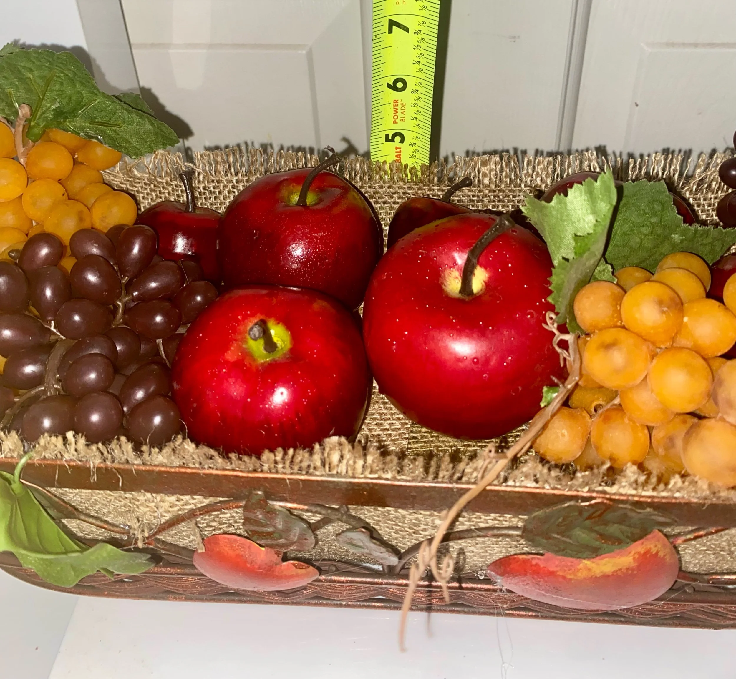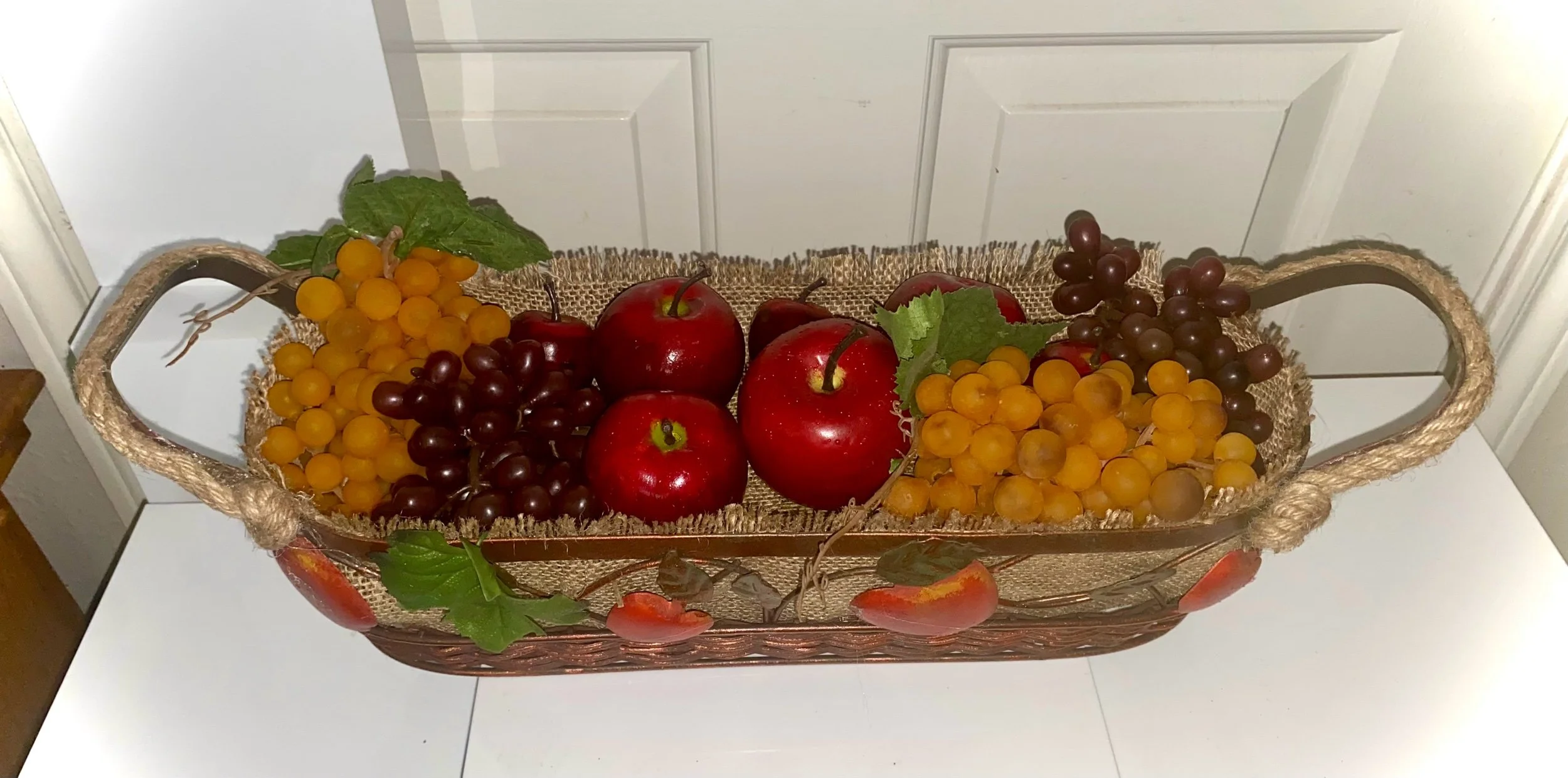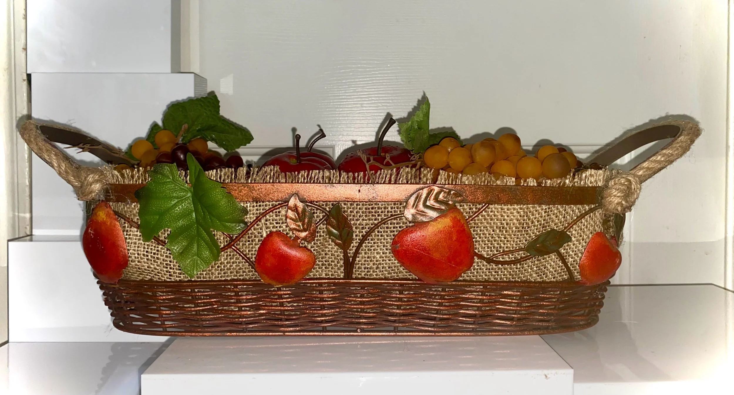 The fruit is nestled in a basket lined with burlap for a rustic or farmhouse aesthetic. The basket itself is a copper-toned metal featuring ornate leaf and apple motifs along the side.