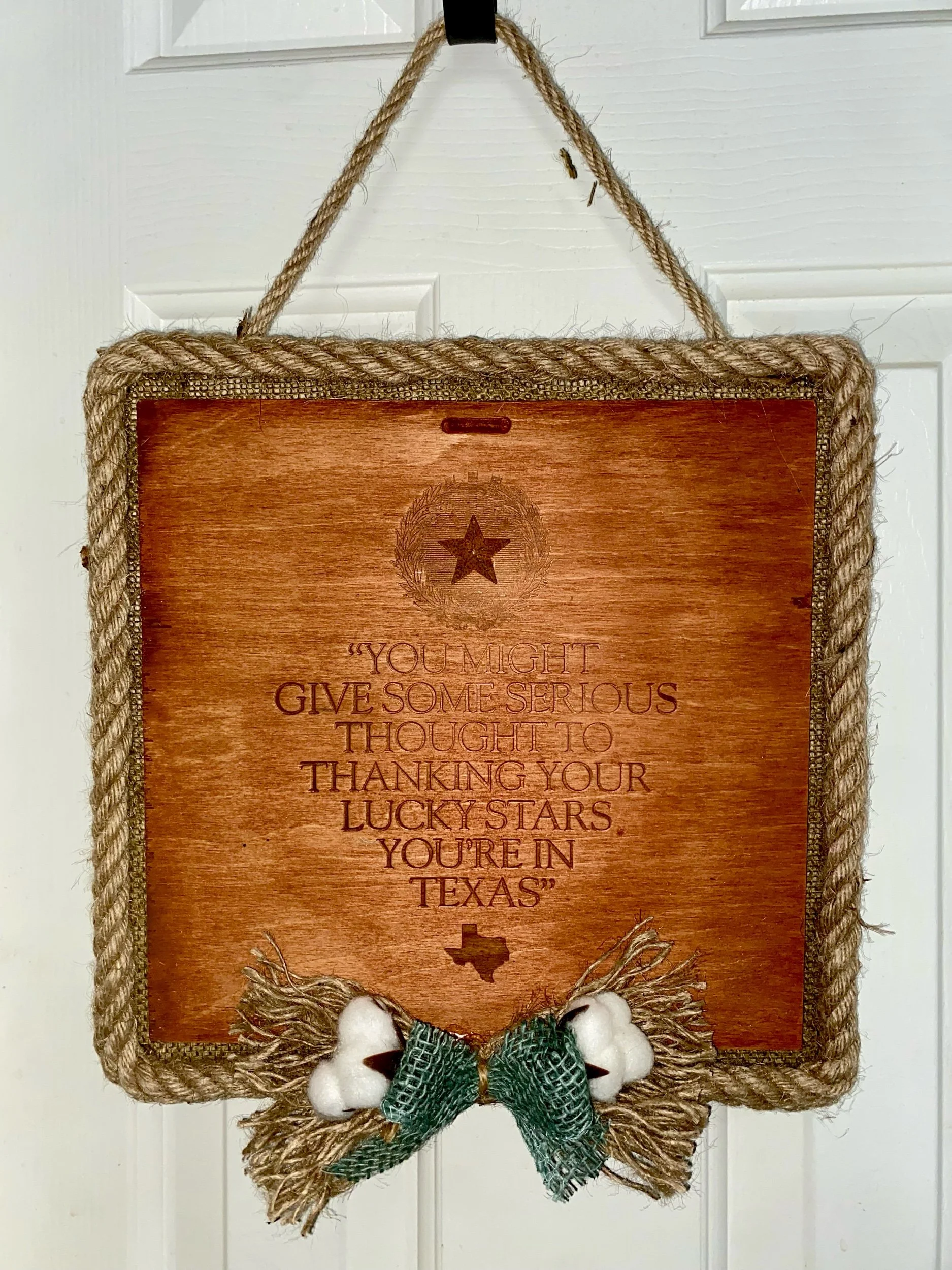 Design Elements: The wooden square is bordered with thick rope, accented with a small wooden star, a silhouette of the state of Texas, and finished with a burlap and cotton boll bow.