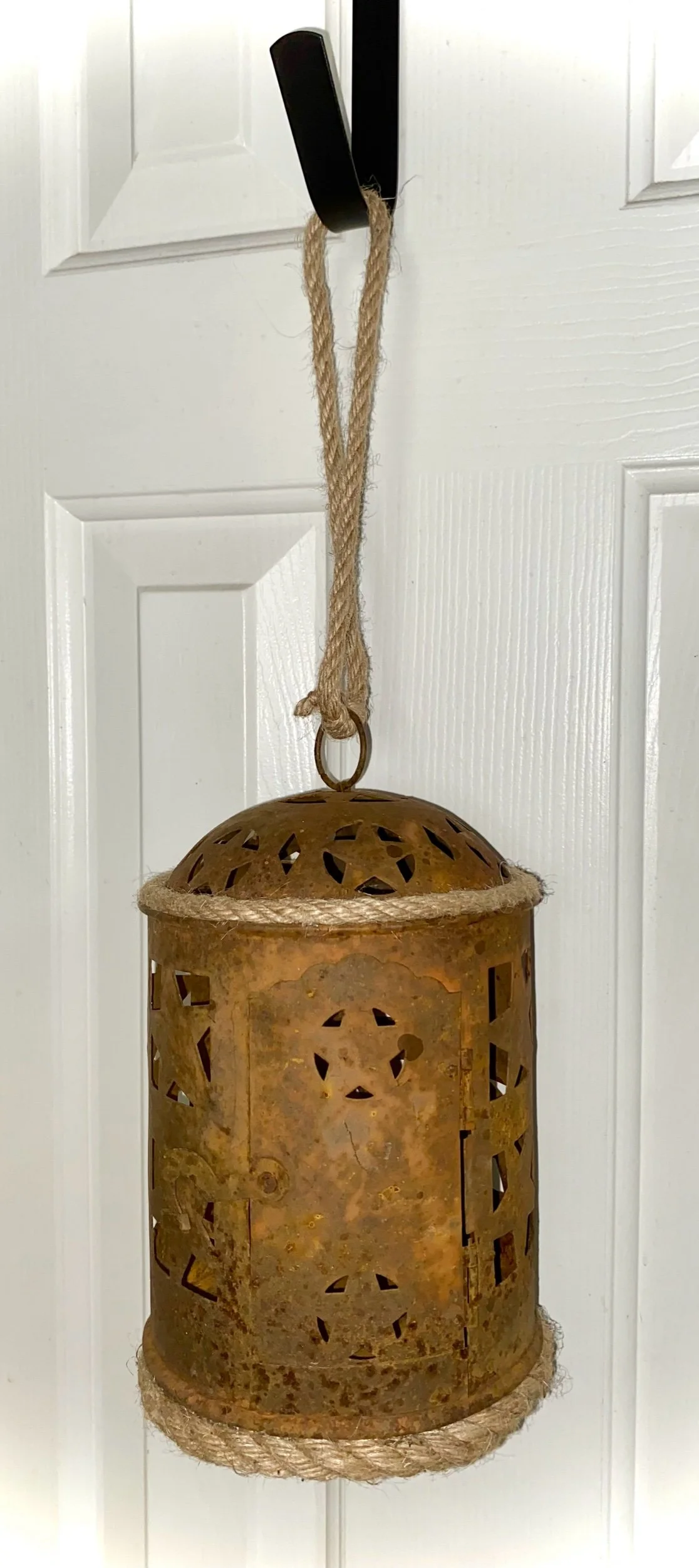 The item is a rustic metal lantern or candle holder, featuring a heavily distressed, weathered finish, star-shaped cutouts with rope detailing and hanger. . These decorative items are designed for tea lights and are popular for rustic, western, or farmhouse-style home decor. Stands 8” tall.