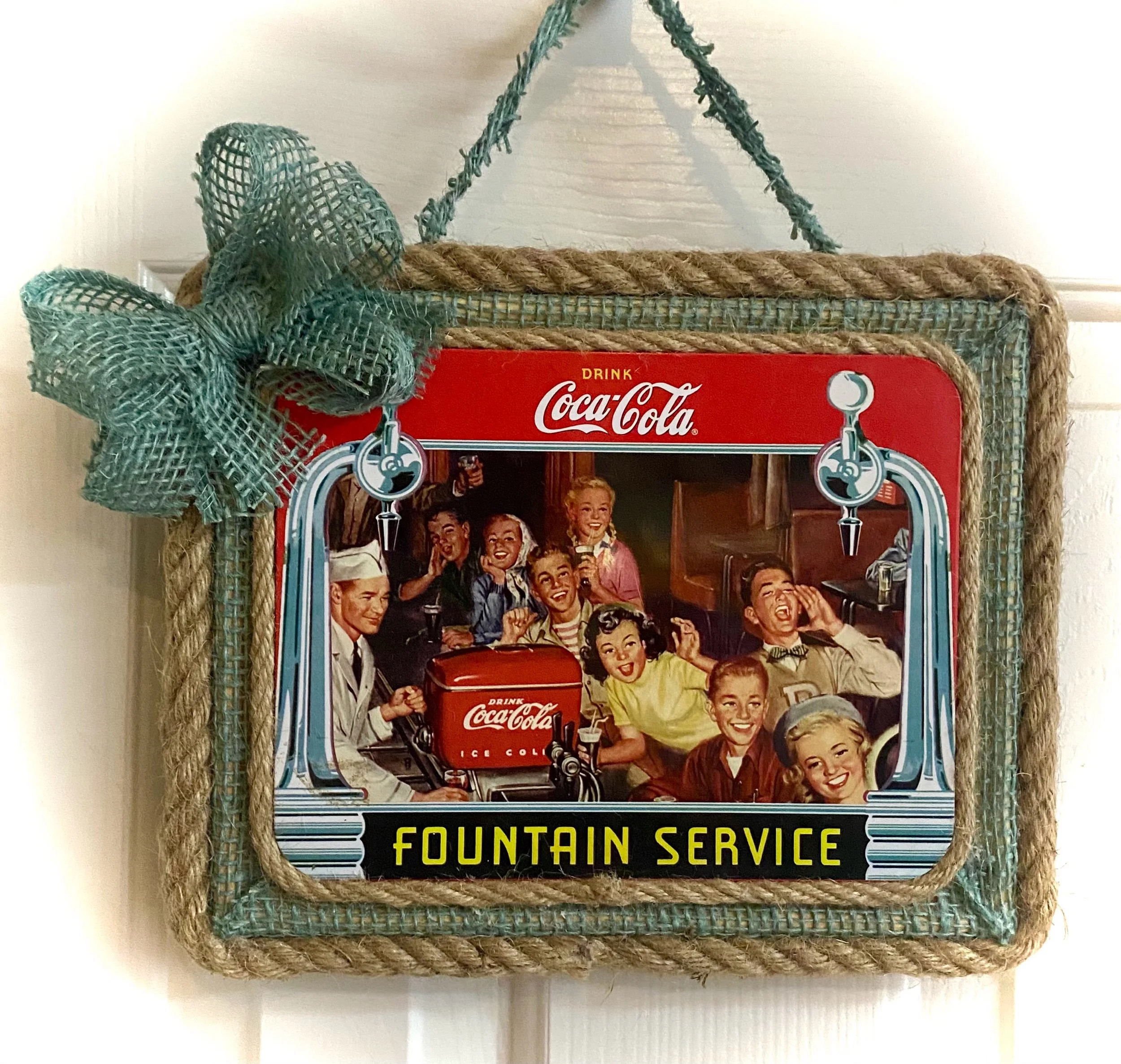 This vintage-style Coca-Cola "Fountain Service" wall hanging features a classic advertisement illustration often used in mid-20th-century marketing. The specific image is a well-known 1950s ad titled "Refreshment... Real Refreshment," originally illustrated by artist Jon Whitcomb.